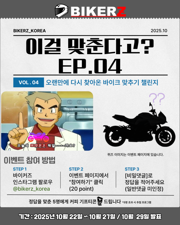 "바이크 맞추기" 이벤트 EP.04 작성자 정보 BIKERZ 작성 작성일 2025.10.21 20:00 컨텐츠 정보 140 조회 15 댓글 0 추천 목록 본문 종료이벤트 진행기간 2025-10-22 ~ 2025-10-27 당첨선물 커피 기프티콘 이벤트 내용 바이커즈 인스타그램 팔로우 @bikerz_korea 오랜만에 돌아온 "오늘의 바이크는 뭘까요~?" 자세히 들여다 보면 보일지도... ??!! "꼭 [비밀댓글] 로 정답을 적어주세요" - 2개의 정답을 모두 맞추어야 합니다. - 정답자 5명 초과 시 랜덤 추첨 프로그램 발표 - 정답자 1명도 없을 시 참여자 전원 추첨 프로그램 발표 <이걸 맞춘다고?!> 자~~~그럼 문제 들어갑니다 0 추천 SNS 공유 관련자료 댓글 15 MotoCam님의 댓글 MotoCam쪽지보내기 자기소개 작성자로 검색 작성글보기쪽지보내기 자기소개 작성자로 검색 작성글보기 작성일 2025.10.21 20:02 오호 커피받으러 고고 RPM 0 오호 커피받으러 고고 Diavel님의 댓글 Diavel쪽지보내기 자기소개 작성자로 검색 작성글보기쪽지보내기 자기소개 작성자로 검색 작성글보기 작성일 2025.10.21 20:13 댓글내용 확인 RPM 0 비밀글 입니다. 포지티브님의 댓글 포지티브쪽지보내기 자기소개 작성자로 검색 작성글보기쪽지보내기 자기소개 작성자로 검색 작성글보기 작성일 2025.10.21 21:00 댓글내용 확인 RPM 0 비밀글 입니다. 문성장님의 댓글 문성장쪽지보내기 자기소개 작성자로 검색 작성글보기쪽지보내기 자기소개 작성자로 검색 작성글보기 작성일 2025.10.22 13:58 난 바알못이 분명하다 RPM 0 난 바알못이 분명하다 c125님의 댓글 c125쪽지보내기 자기소개 작성자로 검색 작성글보기쪽지보내기 자기소개 작성자로 검색 작성글보기 작성일 2025.10.22 14:23 댓글내용 확인 RPM 0 비밀글 입니다. 바람길님의 댓글 바람길쪽지보내기 자기소개 작성자로 검색 작성글보기쪽지보내기 자기소개 작성자로 검색 작성글보기 작성일 2025.10.22 16:13 댓글내용 확인 RPM 0 비밀글 입니다. 츄릅님의 댓글 츄릅쪽지보내기 자기소개 작성자로 검색 작성글보기쪽지보내기 자기소개 작성자로 검색 작성글보기 작성일 2025.10.22 16:22 댓글내용 확인 RPM 0 비밀글 입니다. 가브리엘님의 댓글 가브리엘쪽지보내기 자기소개 작성자로 검색 작성글보기쪽지보내기 자기소개 작성자로 검색 작성글보기 작성일 2025.10.23 00:03 댓글내용 확인 RPM 0 비밀글 입니다. 할리데이비슨님의 댓글 할리데이비슨쪽지보내기 자기소개 작성자로 검색 작성글보기쪽지보내기 자기소개 작성자로 검색 작성글보기 작성일 2025.10.23 09:26 댓글내용 확인 RPM 0 비밀글 입니다. BKNK님의 댓글 BKNK쪽지보내기 자기소개 작성자로 검색 작성글보기쪽지보내기 자기소개 작성자로 검색 작성글보기 작성일 2025.10.23 10:15 댓글내용 확인 RPM 0 비밀글 입니다. HYPER님의 댓글 HYPER쪽지보내기 자기소개 작성자로 검색 작성글보기쪽지보내기 자기소개 작성자로 검색 작성글보기 작성일 2025.10.23 13:57 댓글내용 확인 RPM 0 비밀글 입니다. 메가님의 댓글 메가쪽지보내기 자기소개 작성자로 검색 작성글보기쪽지보내기 자기소개 작성자로 검색 작성글보기 작성일 2025.10.25 21:40 댓글내용 확인 RPM 0 비밀글 입니다. 이디오님의 댓글 이디오쪽지보내기 자기소개 작성자로 검색 작성글보기쪽지보내기 자기소개 작성자로 검색 작성글보기 작성일 2025.10.26 08:25 댓글내용 확인 RPM 0 비밀글 입니다. 바버님의 댓글 바버쪽지보내기 자기소개 작성자로 검색 작성글보기쪽지보내기 자기소개 작성자로 검색 작성글보기 작성일 2025.10.27 00:04 댓글내용 확인 RPM 0 비밀글 입니다. 류피님의 댓글 류피쪽지보내기 자기소개 작성자로 검색 작성글보기쪽지보내기 자기소개 작성자로 검색 작성글보기 작성일 2025.10.27 17:34 너무쉽다~~~~ 카타나 레블500 RPM 0 너무쉽다~~~~ 카타나 레블500 로그인한 회원만 댓글 등록이 가능합니다. 목록