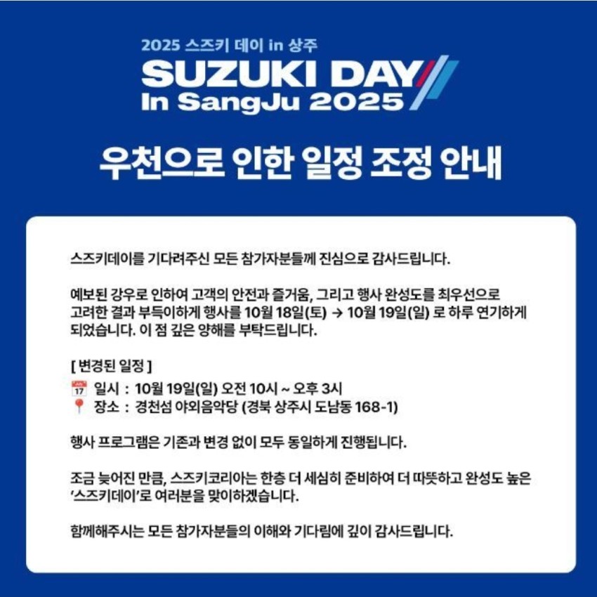 자유게시판 분류 2025 스즈끼데이 (연기 소식) 작성자 정보 아빠이글이쪽지보내기 자기소개 작성자로 검색 작성글보기쪽지보내기 자기소개 작성자로 검색 작성글보기 작성 작성일 2025.10.14 16:57 컨텐츠 정보 22 조회 3 댓글 4 RPM 목록 본문 비가 와도 우의 입고 달려가려 했는데하루 연기가 되었네요더 즐거운 행사를 위해 노력해 주시는것에 감사 하며달려 가려 합니다 4 추천 SNS 공유 신고 관련자료 이전 전투복 라이더 작성일 2025.10.14 21:16 다음 사이드미러 부딪혔을때, 한국이라면 어땠을까 작성일 2025.10.14 16:53 댓글 3 BIKERZ님의 댓글 BIKERZ쪽지보내기 자기소개 작성자로 검색쪽지보내기 자기소개 작성자로 검색 작성일 17:16 많은 분들이 보시고 착오 없으셨으면 좋겠네요~ 신고 RPM 0 많은 분들이 보시고 착오 없으셨으면 좋겠네요~ 뚝배기써라님의 댓글 뚝배기써라쪽지보내기 자기소개 작성자로 검색 작성글보기쪽지보내기 자기소개 작성자로 검색 작성글보기 작성일 17:21 오...감사합니다 연기되었군요 ㅎㅎ 신고 RPM 0 오...감사합니다 연기되었군요 ㅎㅎ 포켓님의 댓글 포켓쪽지보내기 자기소개 작성자로 검색 작성글보기쪽지보내기 자기소개 작성자로 검색 작성글보기 작성일 22:05 더 좋은 행사가 진행되길~~~ 신고 RPM 0 더 좋은 행사가 진행되길~~~ 로그인한 회원만 댓글 등록이 가능합니다. 목록