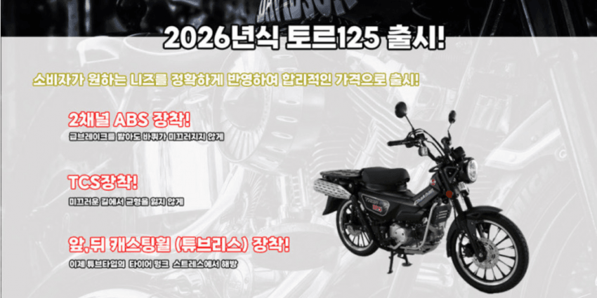 바이크 분류 토르125 는 뭐에요? 헌터커브랑 똑같이 생겼네 작성자 정보 곰방와쪽지보내기 자기소개 작성자로 검색 작성글보기쪽지보내기 자기소개 작성자로 검색 작성글보기 작성 작성일 2026.04.21 15:31 컨텐츠 정보 19 조회 1 댓글 0 RPM 목록 본문 거의 빼다박은것처럼 똑같이 생겼네근데 제원표만 보면 성능도 괜찮아 보이는데혹시 바이커즈에 토르125 타시는분 있나요?어떤가요?? RPM 추천 SNS 공유 × 게시글을 원하는 채널로 공유해보세요. talk f b 관련자료 다음 혼자만 타는데 사진 남기고 싶어서 고민이야용 작성일 2026.04.21 10:01 댓글 1 산넘어산님의 댓글 산넘어산쪽지보내기 자기소개 작성자로 검색 작성글보기쪽지보내기 자기소개 작성자로 검색 작성글보기 작성일 15:32 2채널 abs 에 tcs 까지 ㄷㄷㄷ 신고 RPM 0 [https://bikerz.co.kr/data/editor/2604/cmt_3542391589_6IeqvlyO_0d4a75bcdba30582cb6794c00b8848ede52395aa.png] 2채널 abs 에 tcs 까지 ㄷㄷㄷ 로그인한 회원만 댓글 등록이 가능합니다. 목록