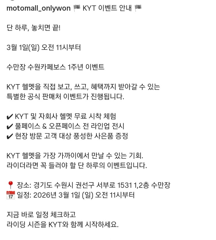 이벤트&행사 분류 까페보스 & KYT 행사 작성자 정보 아빠이글이쪽지보내기 자기소개 작성자로 검색 작성글보기쪽지보내기 자기소개 작성자로 검색 작성글보기 작성 작성일 2026.02.16 21:08 컨텐츠 정보 23 조회 0 RPM 목록 본문 3월1일 까페보스 와 KYT 콜라보가 있네요 0 추천 SNS 공유 신고 관련자료 다음 혼다코리아 2월 프로모션 작성일 2026.02.13 13:22 댓글 0 등록된 댓글이 없습니다. 로그인한 회원만 댓글 등록이 가능합니다. 목록