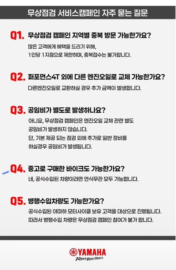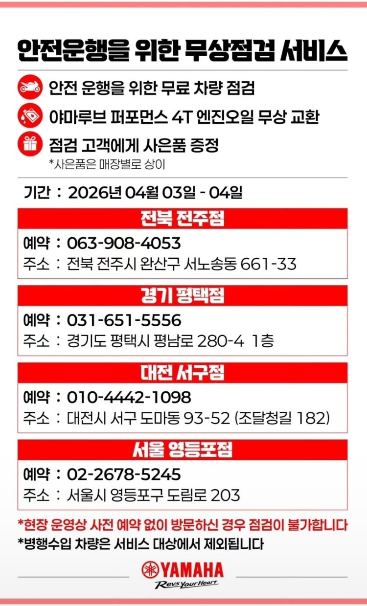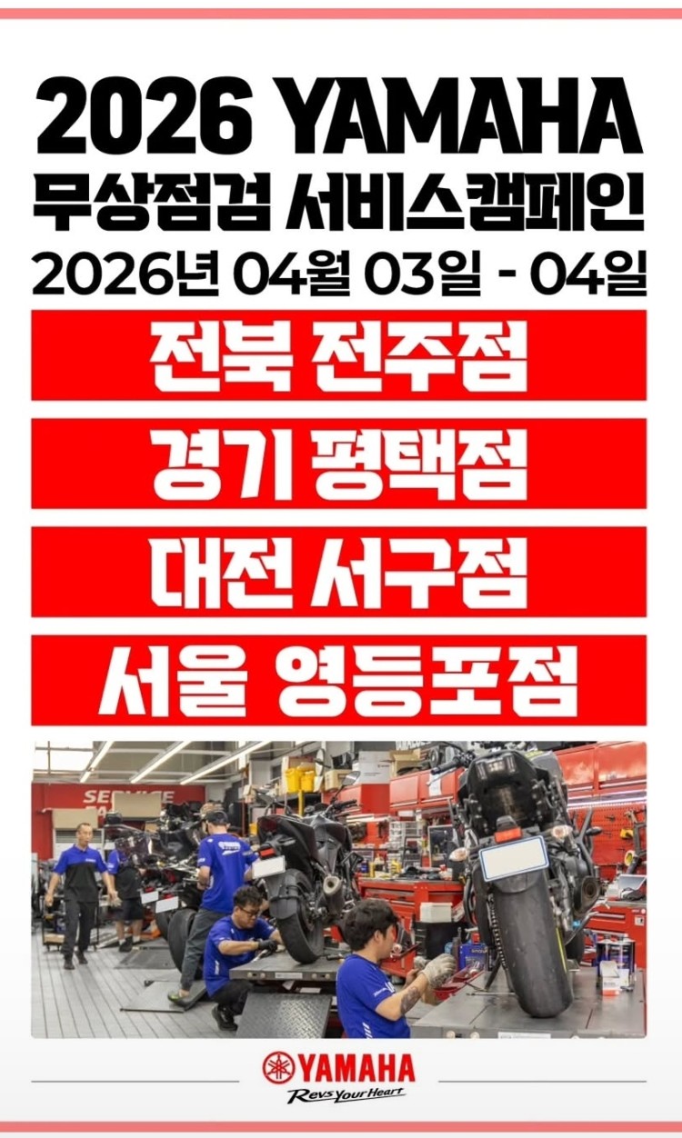 뉴스&소식 분류 Yamaha 좋은 소식 작성자 정보 아빠이글이쪽지보내기 자기소개 작성자로 검색 작성글보기쪽지보내기 자기소개 작성자로 검색 작성글보기 작성 작성일 2026.03.27 23:44 컨텐츠 정보 11 조회 0 RPM 목록 본문 무상 점검무상 오일 교화 좋겠다Yamaha 💕 0 추천 SNS 공유 신고 관련자료 다음 두카티 시승회 하네요 (부산) 작성일 2026.03.26 13:17 댓글 0 등록된 댓글이 없습니다. 로그인한 회원만 댓글 등록이 가능합니다. 목록