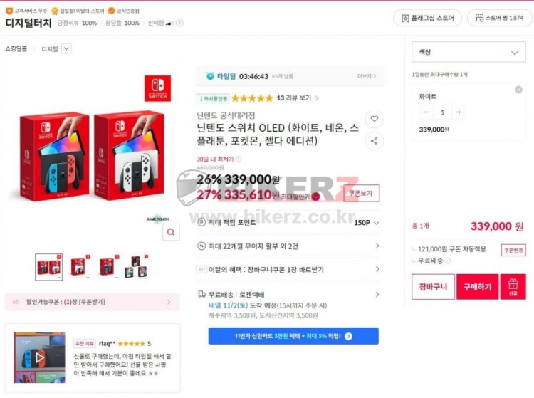 PC전자제품 분류 닌텐도 스위치 OLED (화이트, 네온, 스플래툰, 포켓몬, 젤다 에디션) 작성자 정보 분분쪽지보내기 자기소개 작성자로 검색 작성글보기쪽지보내기 자기소개 작성자로 검색 작성글보기 작성 작성일 2024.11.01 11:23 컨텐츠 정보 514 조회 3 댓글 1 RPM 목록 본문 진행상태 종료 링크 방문하기(클릭) 판매처 11번가 가격 335,610 공식대리점이고 신한카드 335,610원 나오네요 1 추천 SNS 공유 신고 관련자료 링크 https://www.11st.co.kr/products/7345686531 9 회 연결 이전 신타6 빅찬스 작성일 2024.11.01 13:19 다음 MSI MAG 박격포 B650M Wi-Fi (체감가 166,530) 작성일 2024.11.01 11:18 댓글 3 언프리티님의 댓글 언프리티쪽지보내기 자기소개 작성자로 검색 작성글보기쪽지보내기 자기소개 작성자로 검색 작성글보기 작성일 24-11-04 요즘 중고도 30임 달려 신고 RPM 0 요즘 중고도 30임 달려 스나이퍼님의 댓글 스나이퍼쪽지보내기 자기소개 작성자로 검색 작성글보기쪽지보내기 자기소개 작성자로 검색 작성글보기 작성일 24-11-04 젤다하고싶다...팔았는데 다시 살까 고민중이네요 신고 RPM 0 젤다하고싶다...팔았는데 다시 살까 고민중이네요 아빠이글이님의 댓글 아빠이글이쪽지보내기 자기소개 작성자로 검색 작성글보기쪽지보내기 자기소개 작성자로 검색 작성글보기 작성일 25-03-31 안라무복 ,행복한 나날 되세요~ 신고 RPM 0 안라무복 ,행복한 나날 되세요~ 로그인한 회원만 댓글 등록이 가능합니다. 목록
