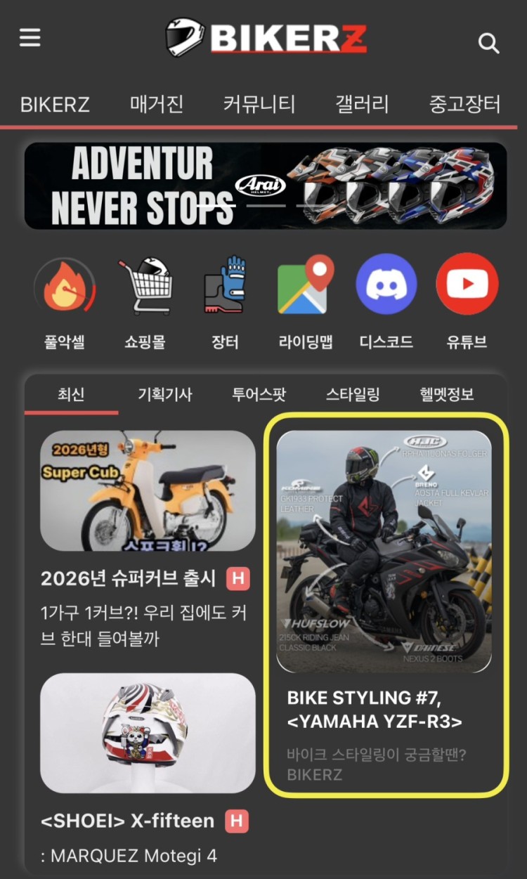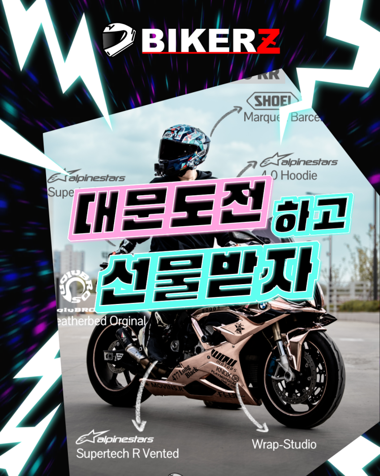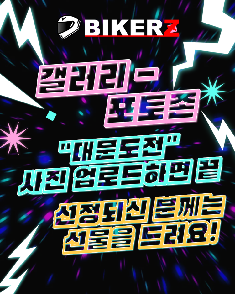 BIKERZ 대문도전 이벤트 (상시) 작성자 정보 BIKERZ 작성 작성일 2026.04.20 20:10 컨텐츠 정보 33 조회 4 댓글 1 추천 목록 본문 진행이벤트 진행기간 2026-04-20 ~ 2026-12-31 당첨선물 주유권, 자체제작상품 등 문의접수 1:1문의하기 응모방법 대문도전 사진 업로드 추첨방식 BIKERZ 선정 이벤트 내용 안녕하세요 BIKERZ 입니다대문도전 이벤트 (상시) 시작합니다!갤러리 - 포토존 에 '대문도전' 카테고리로 내 사진을 올려보세요대문에 선정되신 분께는 BIKERZ 자체 제작 상품, 주유권 등의 선물을 드려요 대문 사진은 스타일링 정보를 포함하여 아래와 같이 게재됩니다 ʕง•ᴥ•ʔง RPM 1 추천 참여하기 현재까지 총 참여자: 0명 상시 진행되는 이벤트입니다 point 사용 참여 0 참여마감: 26년 12월 31일(목) 00시 해당 이벤트는 진행중입니다. 배팅 참여회원 리스트 MY신청관리 번호 닉네임 신청일 당첨여부 1(current) 관련자료 댓글 4 김해김씨님의 댓글 김해김씨쪽지보내기 자기소개 작성자로 검색 작성글보기쪽지보내기 자기소개 작성자로 검색 작성글보기 작성일 20:22 일단 살좀 빼고 오겠습니다 신고 RPM 0 일단 살좀 빼고 오겠습니다 베돌이님의 댓글 베돌이쪽지보내기 자기소개 작성자로 검색 작성글보기쪽지보내기 자기소개 작성자로 검색 작성글보기 작성일 20:22 선물은 랜덤인가요? 신고 RPM 0 선물은 랜덤인가요? 긴급탈출님의 댓글 긴급탈출쪽지보내기 자기소개 작성자로 검색 작성글보기쪽지보내기 자기소개 작성자로 검색 작성글보기 작성일 20:23 숨겨놨던 나의 사진들을 대방출... 신고 RPM 0 숨겨놨던 나의 사진들을 대방출... 귀신님의 댓글 귀신쪽지보내기 자기소개 작성자로 검색 작성글보기쪽지보내기 자기소개 작성자로 검색 작성글보기 작성일 20:23 하나만 걸려라 마인드로 물량전 해도 되나여 신고 RPM 0 하나만 걸려라 마인드로 물량전 해도 되나여 로그인한 회원만 댓글 등록이 가능합니다. 목록