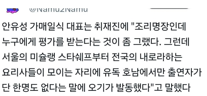 유머n이슈 분류 <흑백요리사> 안유성 셰프가 대단한 이유 작성자 정보 한화이글스쪽지보내기 자기소개 작성자로 검색 작성글보기쪽지보내기 자기소개 작성자로 검색 작성글보기 작성 작성일 2024.10.03 22:00 컨텐츠 정보 2,891 조회 23 RPM 목록 본문 23 추천 SNS 공유 신고 관련자료 이전 5대 치킨 프랜차이즈 점주들 작성일 2024.10.03 22:15 다음 그알펌)요즘 2.30대 사이 심각한 사회문제 작성일 2024.10.03 14:38 댓글 0 등록된 댓글이 없습니다. 로그인한 회원만 댓글 등록이 가능합니다. 목록