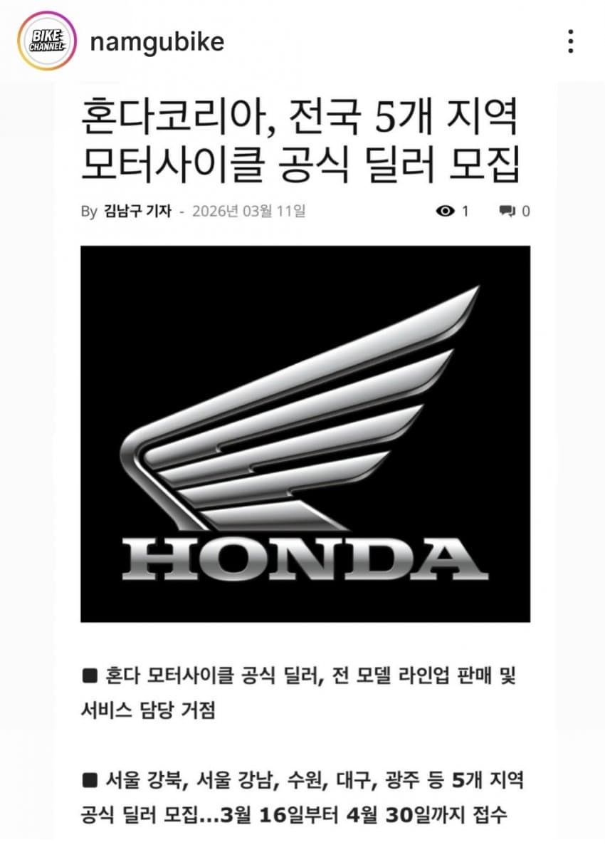 자유게시판 분류 혼다 딜러점 모집 빡세게 하네 작성자 정보 서울대학교쪽지보내기 자기소개 작성자로 검색 작성글보기쪽지보내기 자기소개 작성자로 검색 작성글보기 작성 작성일 2026.03.11 13:05 컨텐츠 정보 20 조회 0 RPM 목록 본문 5개지역 동시에 추가 ㄷㄷㄷ다 직영점으로 바꾼다 소리 있었는데쏙들어간듯 ? 0 추천 SNS 공유 신고 관련자료 이전 블랙박스 추천좀 가능할까요 작성일 2026.03.11 13:08 다음 건봉령승호대 라이딩 고고~~ 작성일 2026.03.11 09:21 댓글 0 등록된 댓글이 없습니다. 로그인한 회원만 댓글 등록이 가능합니다. 목록