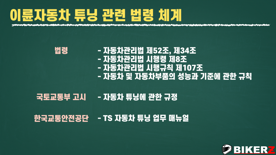 먼저, 이륜자동차 튜닝 관련 법령 체계는 다음과 같습니다