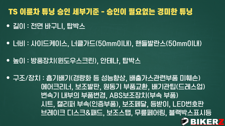 불법튜닝을 근절하자는 취지도 좋고, TS에서 세부 기준을 통해 일부는 명확하게 명시를 해주었지만, 이륜차의 튜닝파츠 라는 장르는 합법과 불법의 경계가 정말 애매한 경우가 많기 때문에 아직 우려스러운 부분입니다