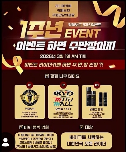 이벤트&행사 분류 까페보스 & KYT 행사 작성자 정보 아빠이글이쪽지보내기 자기소개 작성자로 검색 작성글보기쪽지보내기 자기소개 작성자로 검색 작성글보기 작성 작성일 2026.02.16 21:08 컨텐츠 정보 34 조회 0 RPM 목록 본문 3월1일 까페보스 와 KYT 콜라보가 있네요 0 추천 SNS 공유 신고 관련자료 다음 혼다코리아 2월 프로모션 작성일 2026.02.13 13:22 댓글 0 등록된 댓글이 없습니다. 로그인한 회원만 댓글 등록이 가능합니다. 목록
