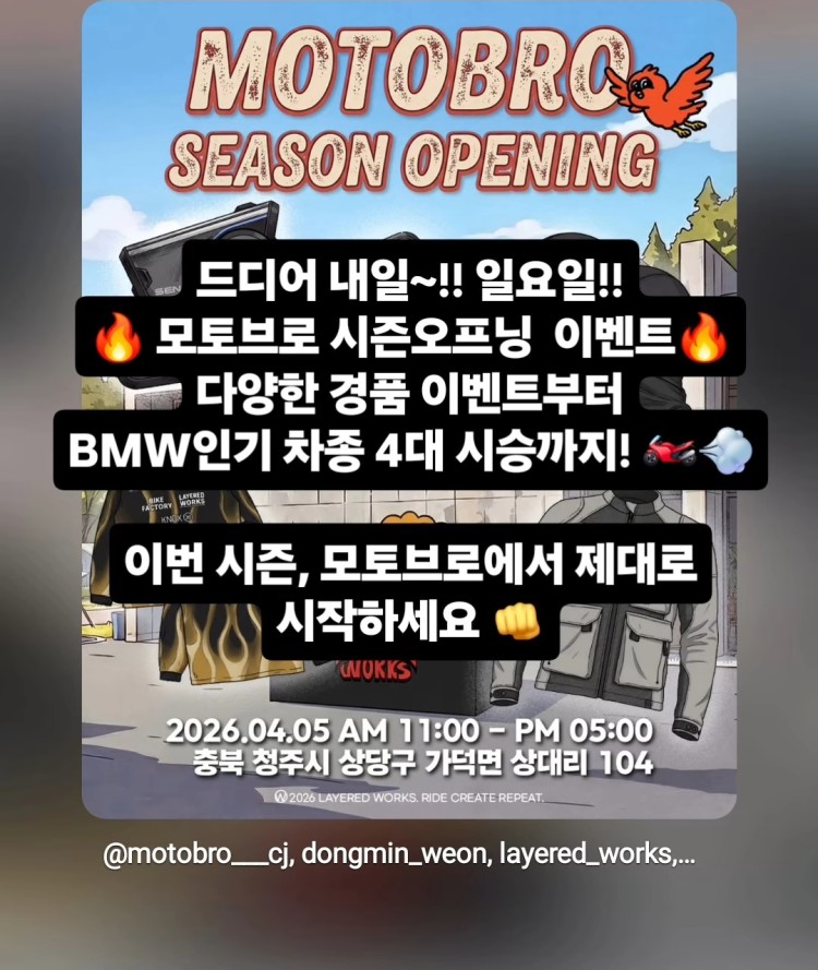 이벤트&행사 분류 서둘러봐요~청주 모토브로 행사 작성자 정보 아빠이글이쪽지보내기 자기소개 작성자로 검색 작성글보기쪽지보내기 자기소개 작성자로 검색 작성글보기 작성 작성일 2026.04.05 10:01 컨텐츠 정보 42 조회 2 댓글 1 RPM 목록 본문 오늘 당장 입니다 RPM 1 추천 SNS 공유 × 게시글을 원하는 채널로 공유해보세요. talk f b 관련자료 이전 충청도인 이벤트~ 작성일 2026.04.06 08:49 다음 가와사키 메구로 S1 가격공개 - 990만원 작성일 2026.04.04 09:29 댓글 2 Diavel님의 댓글 Diavel쪽지보내기 자기소개 작성자로 검색 작성글보기쪽지보내기 자기소개 작성자로 검색 작성글보기 작성일 26-04-05 멀어요~~~멀어 신고 RPM 0 멀어요~~~멀어 아빠이글이님의 댓글의 댓글 아빠이글이쪽지보내기 자기소개 작성자로 검색 작성글보기쪽지보내기 자기소개 작성자로 검색 작성글보기 작성일 26-04-06 피반령 가는 길에 있는 모토브로 큰길로만 피반령을 다니다 모토브로 덕분에 또 다른 길로 어제 피반령을 다녀 왔는데 한적한 시골길 벗꽃도 시넷물도 참 이쁘더라고요 신고 RPM 0 피반령 가는 길에 있는 모토브로 큰길로만 피반령을 다니다 모토브로 덕분에 또 다른 길로 어제 피반령을 다녀 왔는데 한적한 시골길 벗꽃도 시넷물도 참 이쁘더라고요 로그인한 회원만 댓글 등록이 가능합니다. 목록