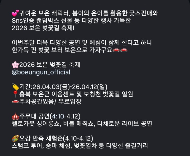 뉴스&소식 분류 막바지 벗꽃 보러 가요~ 작성자 정보 아빠이글이쪽지보내기 자기소개 작성자로 검색 작성글보기쪽지보내기 자기소개 작성자로 검색 작성글보기 작성 작성일 2026.04.08 09:25 컨텐츠 정보 44 조회 1 댓글 1 RPM 목록 본문 벗꽃길 20km 라는 말에 혹해서2026 첫 템덤보은 벗꽃 축제 ,충주호 갈팡지팡 중~ RPM 1 추천 SNS 공유 × 게시글을 원하는 채널로 공유해보세요. talk f b 관련자료 첨부 Screen_Recording_20260408_092115_Instagram.mp4 파일크기 (28.3M) 등록일 2026.04.08 09:25 이전 혼다 4월 벚꽃 프로모션 작성일 2026.04.08 22:34 다음 대한민국 숙박 세일 페스타 또 하네요 작성일 2026.04.08 04:38 댓글 1 MBTI님의 댓글 MBTI쪽지보내기 자기소개 작성자로 검색 작성글보기쪽지보내기 자기소개 작성자로 검색 작성글보기 작성일 26-04-08 벚꽃이 이미 떨어지가 시작했다면 철원으로 가보세요~~~ ㅋㅋ 신고 RPM 1 벚꽃이 이미 떨어지가 시작했다면 철원으로 가보세요~~~ ㅋㅋ 로그인한 회원만 댓글 등록이 가능합니다. 목록